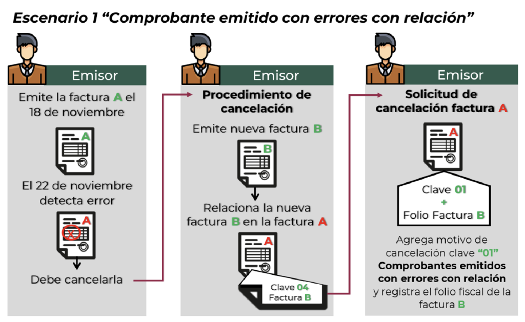 Antes de cancelar la factura A, crea el nuevo CFDI con los datos correctos (en el diagrama anterior sería la factura B), activar la opción “Agregar datos opcionales” y seleccionar “si” en el campo CFDI relacionado y el tipo de relación a seleccionar es 04 – Sustitución de los cfdis previos, por último, seleccionar el UID de la factura que se va a cancelar, completar los datos de la factura con la corrección correspondiente y timbrarla.