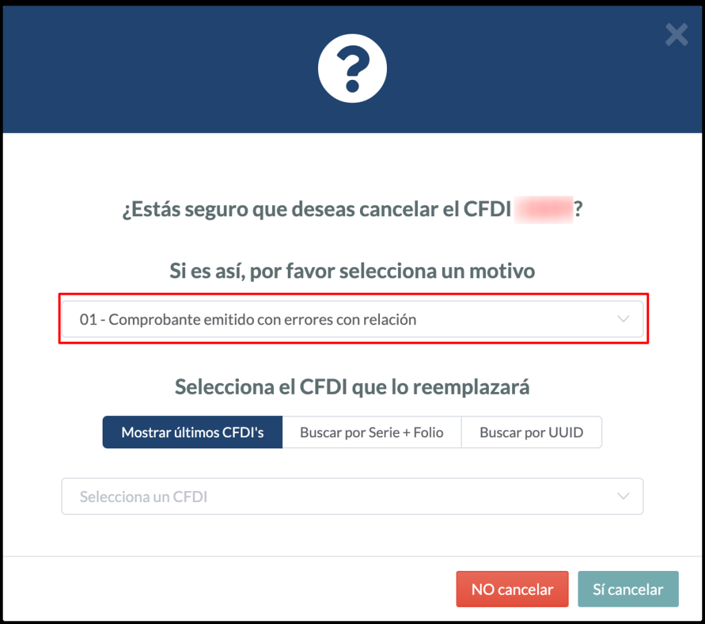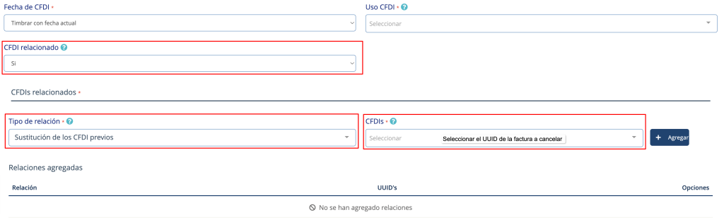 Para los CFDI’s que contengan errores y se relacionan con el CFDI que es sustituido. Debe señalarse el folio fiscal o UUID del comprobante que se sustituye.